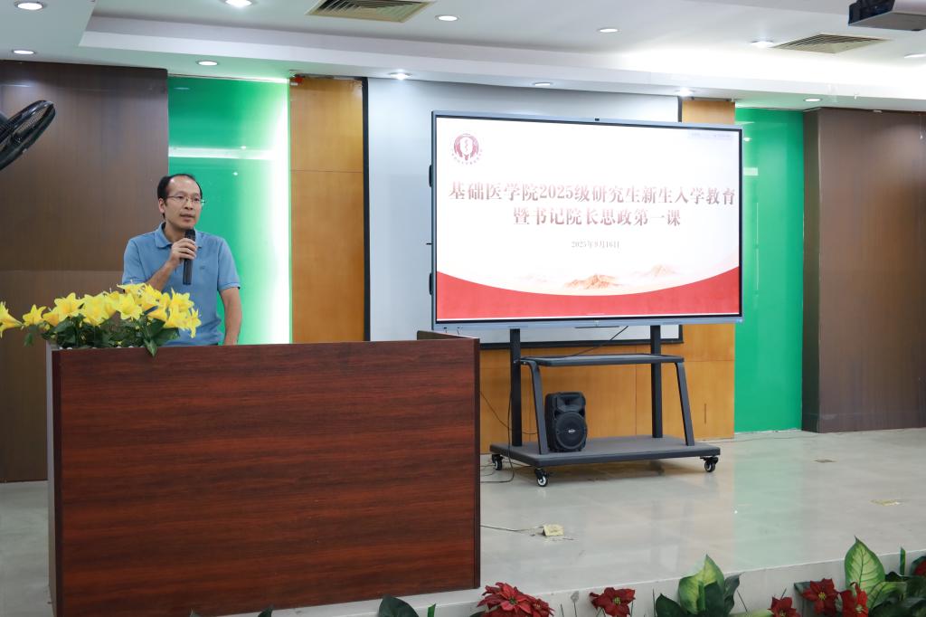 9月16日,基础医学院开展2025级研究生新生入学教育暨思政第一课。学院党委书记谢沫珠,院长李雄,副院长尹辉、毛建文,2025级研究生导师、辅导员和全体新生参加大会。大会由学院副院长尹辉主持。