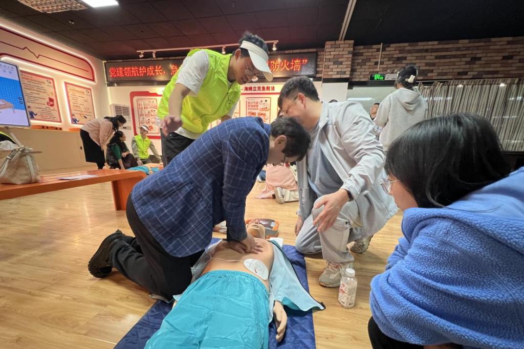 在实操环节,大家重点演练了胸外按压技巧与人工呼吸的配合,并学习了如何正确操作AED设备,包括开机、贴放电极片、分析心律、实施电击等标准化步骤,明确了“每做30次胸外按压进行2次人工呼吸”的标准流程。大家还通过情景模拟掌握了CPR与AED的协同应用,即在实施心肺复苏的同时尽快获取并使用AED,形成完整高效的急救链条。此外,大家还通过“剪刀石头布定位法”等形象教学,熟练掌握了气道异物梗塞的急救手法,包括站位、定位、冲击等关键步骤,以及特殊情况下的自救方法。