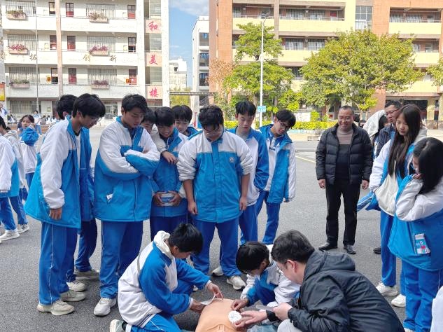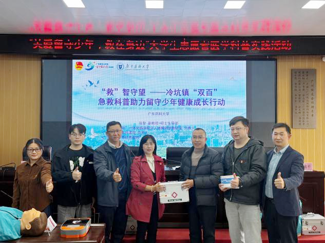 为贯彻落实《广东药科大学助力怀集县、罗定市实施“百县千镇万村高质量发展工程”行动计划(2023-2027),推动“1+1+N”党建结对共建模式落地见效,12月16日,我校基础医学院教工第二党支部联合教务部党支部赴怀集县冷坑镇开展“党建+教育协同”主题活动,组织大学生志愿者为冷坑中学的留守少年带来了一堂生动而扎实的急救医学科普实践课。学校“双百行动”驻县服务队长张锡钦,基础医学院教工第二党支部书记张黎,教务部副部长张珍,冷坑中学校长熊爱良,党支部书记、副校长林和平,相关党支部成员及“救”智守望突击队成员参加活动。