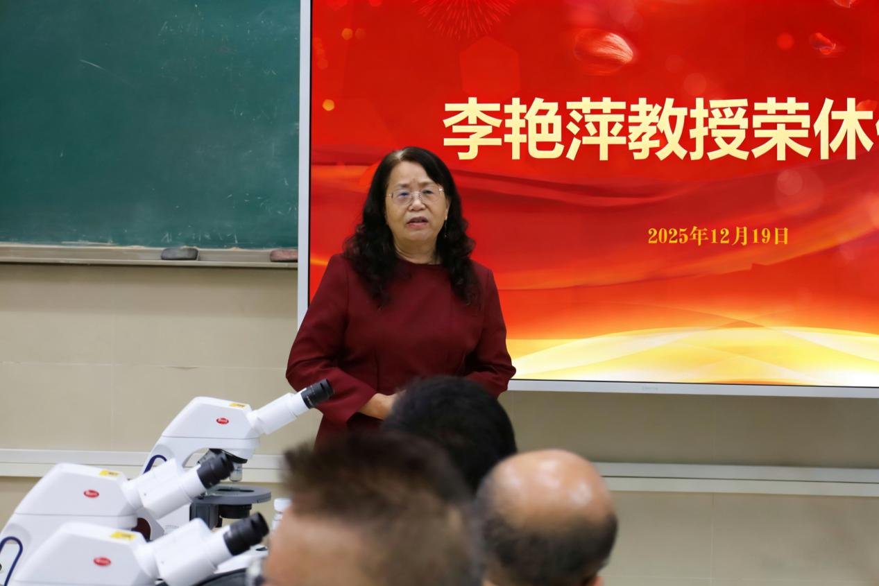 谢沫珠代表学院全体干部职工向李艳萍教授致以最崇高的敬意、最诚挚的感谢和最美好的祝福。她代表学院感恩李艳萍教授的无私奉献:在管理岗位上恪尽职守,在教学一线立德树人,在队伍建设上言传身教,用近二十载的坚守与付出为学校的发展、学院的建设、人才的培养立下了汗马功劳。她要求全院上下要传承发扬李艳萍教授的优良作风,指出李艳萍教授身上爱岗敬业、求真务实、关爱师生、潜心钻研的精神是我们做好工作的宝贵精神财富。她衷心祝愿李艳萍教授退休后的生活幸福美满、健康舒心,同时希望李艳萍教授常回“家”看看,一如既往地关心和支持学校、学院的发展,为基础医学学科建设多提宝贵意见和建议。