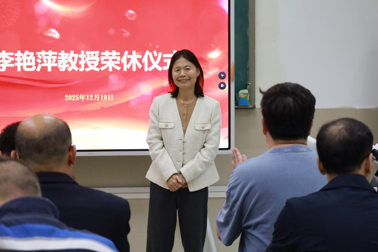 在热烈的掌声中,李艳萍教授发表了饱满深情的退休感言,回顾自己三十余载的从教历程,尤其感念在广东药科大学近二十年的躬耕岁月,回忆起自己教学生涯中点点滴滴的难忘瞬间,充满了对育人事业的热爱与执着。她由衷感谢学院党委、工会及系部同事们对其荣休事宜的重视,精心筹备的 “最美一课”,并对学校和学院表达了美好的祝愿。