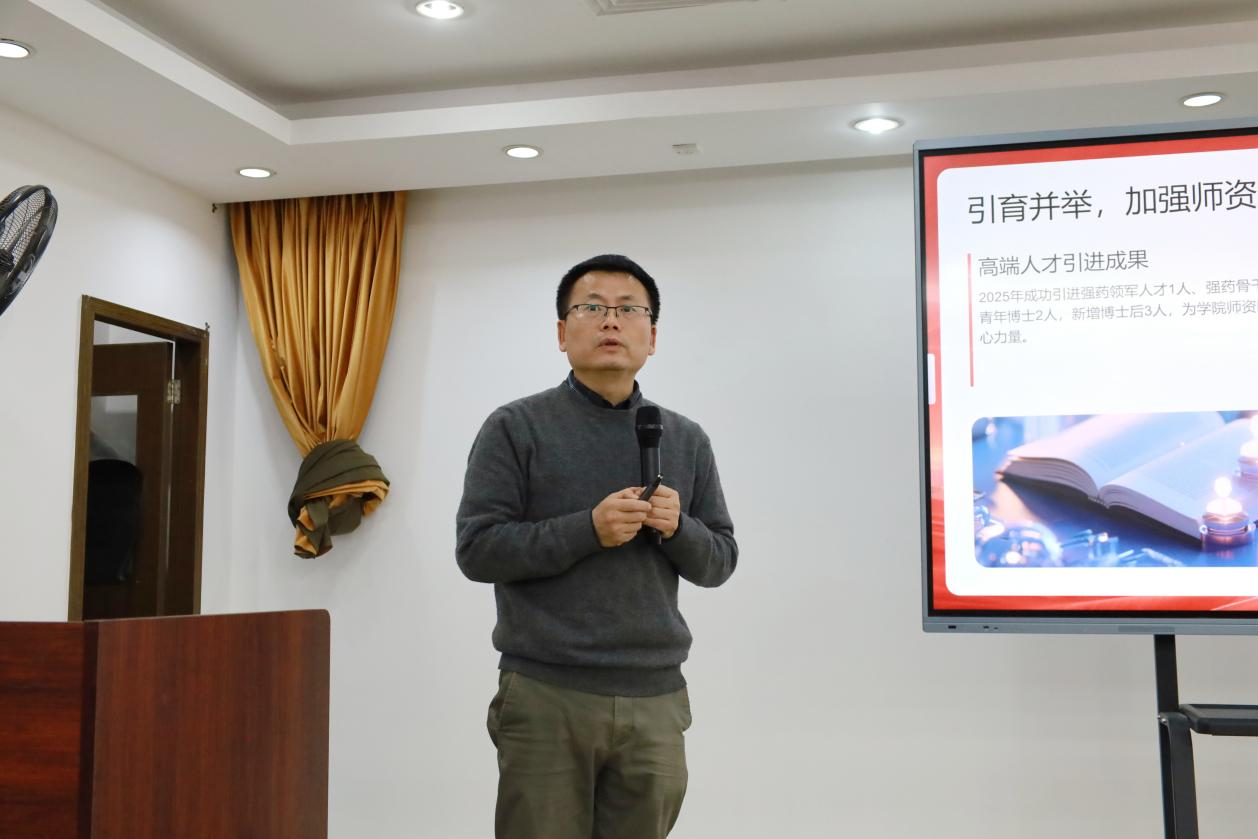 院长李雄在会上作了学院行政2025年工作总结与2026年工作要点汇报。他指出,2025年学院引育并举强化师资队伍,成功引进高层次人才4人、新增博士后3人,教师教学能力培训覆盖235人次,“AI+基础医学教育”转型成效初显;人才培养质量稳步提升,顺利申报首个本科专业,学生获国家级竞赛奖项2项、省级6项;科研创新能力有所增强,获国自然等各级课题17项,发表高水平论文64篇,2个院企联合教学平台建成并投用,产学研成果落地服务地方发展。2026年学院将聚焦人才队伍建设、有组织科研、数智化教学转型、人才培养质量提升、教师教学水平提升等重点,力争实现国自然申报数量与资助率双突破、专任教师AI教学培训覆盖率达60%,新增校级及以上一流课程,培育省级教学成果奖,全力向高水平基础医学院建设目标迈进。